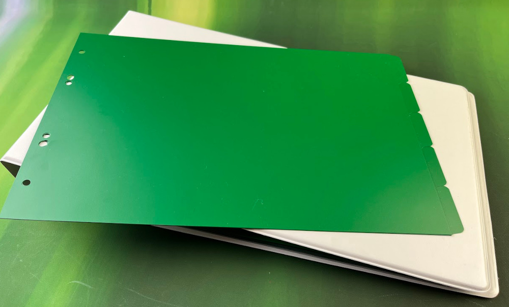 Emerald Green coloured and supplied as a set of 5 tabbed dividers. These are not ordinary dividers as they are made to allow the tabs to extend out beyond the edge of the pockets or A4 landscape paper, but remain within the parameters of our binders. Being pre-punch with 6 holes to suit both 2 and 4 ring or D ring landscaspe binders, they are ideal for use in high usage environments due to the strong quality 200 micron rigid polypropylene material used in their manufacture.
