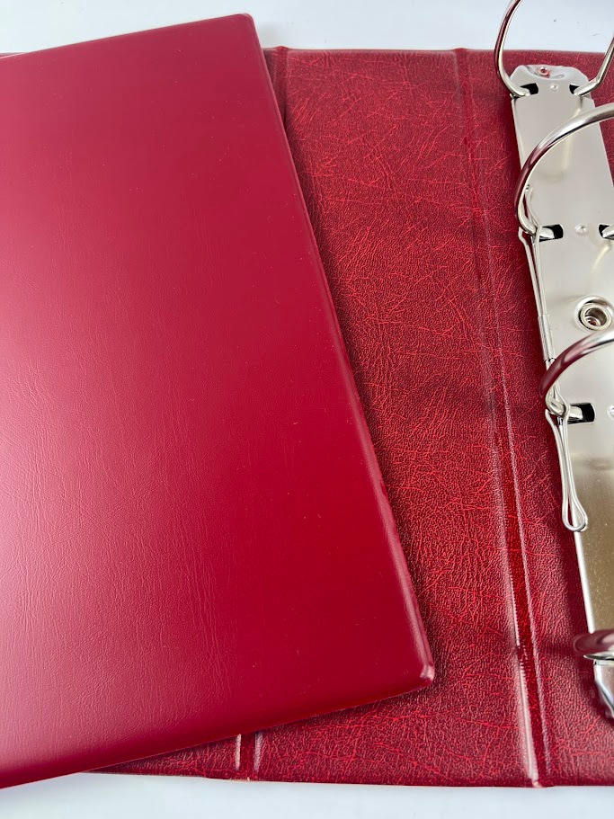 The binder lays flat when open and there is a small pocket for a name card on the spine.