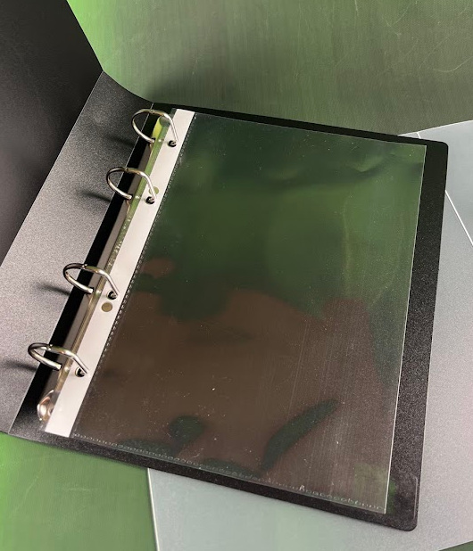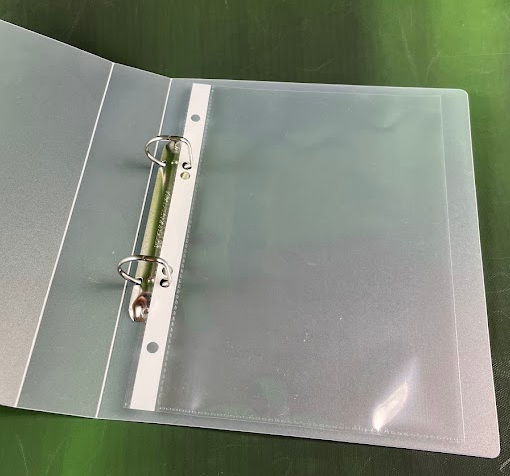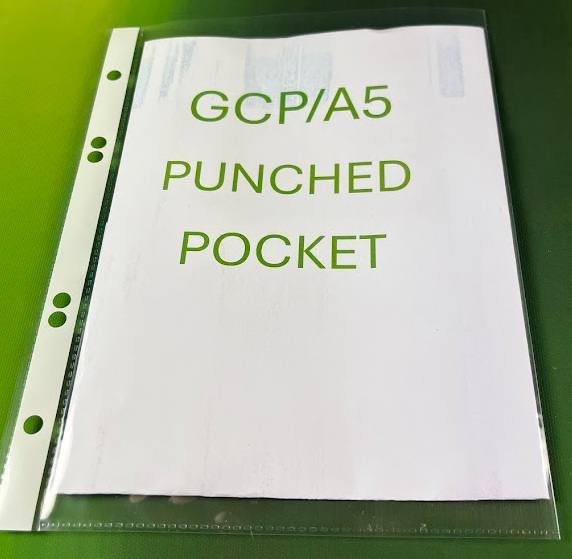 80 micron glass clear polyprop with white strip in binding margin.